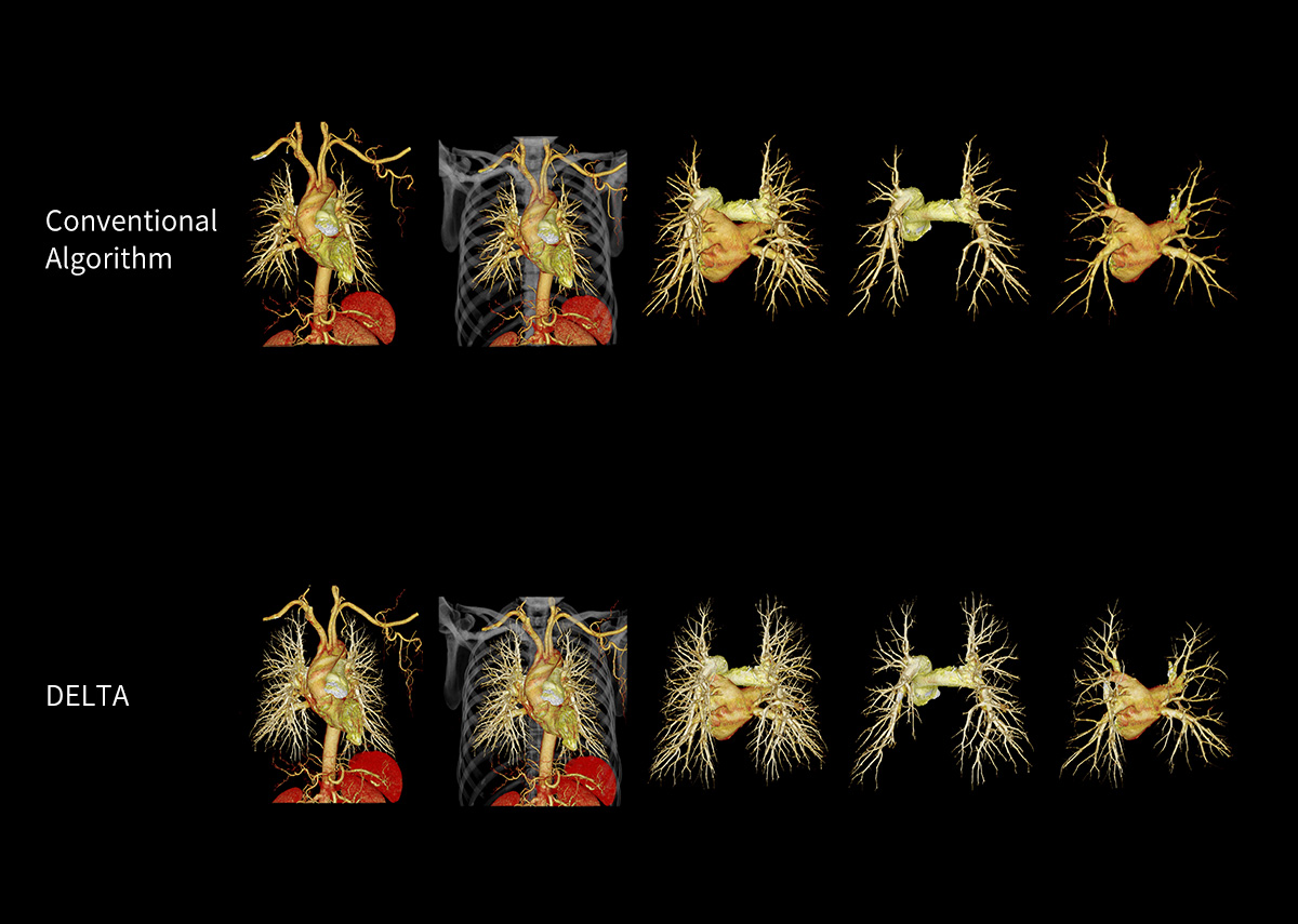 Comparativ cu algoritmul convențional, DELTA oferă rezultate superioare în extragerea atât a arterelor pulmonare distale, cât și a venelor.
