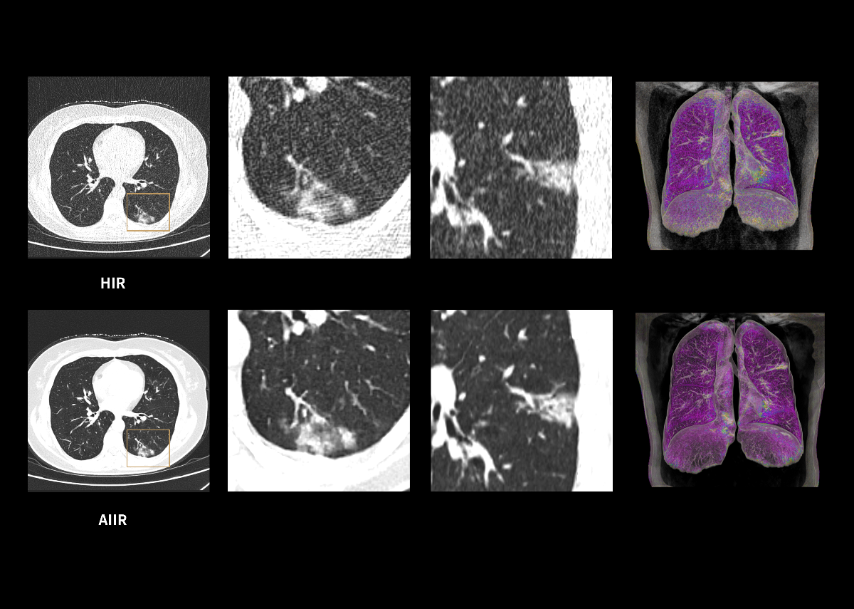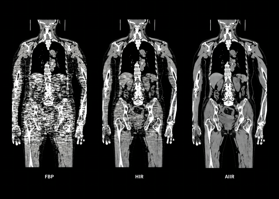 Pe scurt, AIIR utilizează inteligența artificială pentru o reducere robustă a zgomotului și o textură naturală a imaginii, iar prin MBIR obține o redare precisă a structurilor anatomice și o suprimare eficientă a artefactelor. Această combinație depășește limitele folosirii individuale a reconstrucției MBIR sau a reconstrucției bazate pe deep learning (DLR).