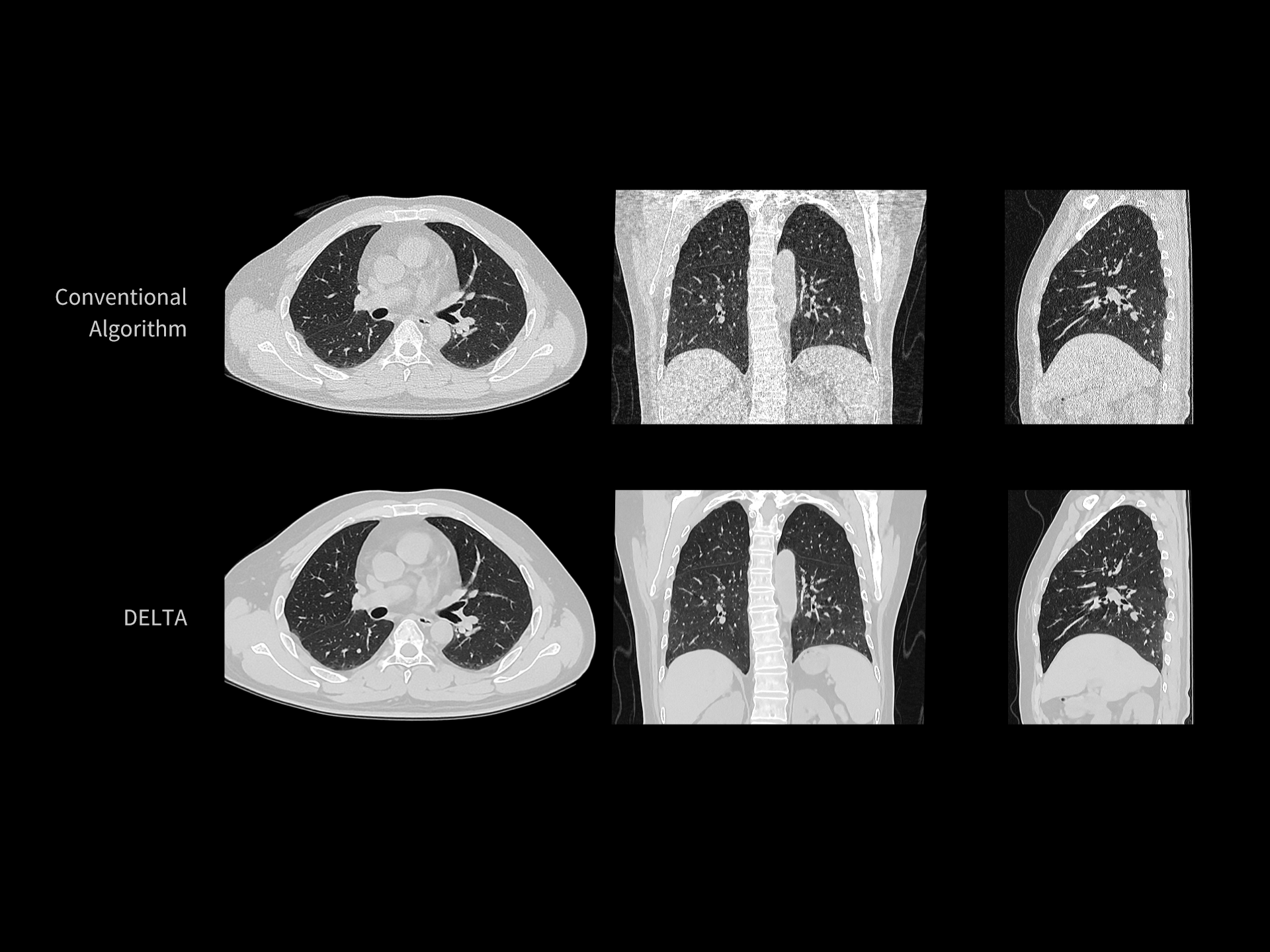 DELTA (Deep Learning Trained Algorithm) oferă un echilibru optim între calitatea ridicată a imaginii, doză redusă de radiații și viteză rapidă de reconstrucție – un obiectiv dificil de atins până acum. Prin această performanță, DELTA stabilește un nou reper în imagistica CT.