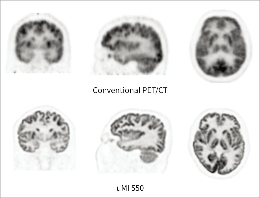 uMI 550 face ca tehnologia PET digitală de ultimă generație să fie accesibilă pentru mai mulți utilizatori. Cu detectorul unic Integrated-Light-Guide Digital PET, uMI 550 oferă o rezoluție NEMA de 2,9 mm. Sistemul CT cu 80 de slice-uri, dotat cu Z-Detector inovator, furnizează imagini CT de diagnostic cu rezoluție spațială ridicată și o detectabilitate îmbunătățită a contrastului scăzut.