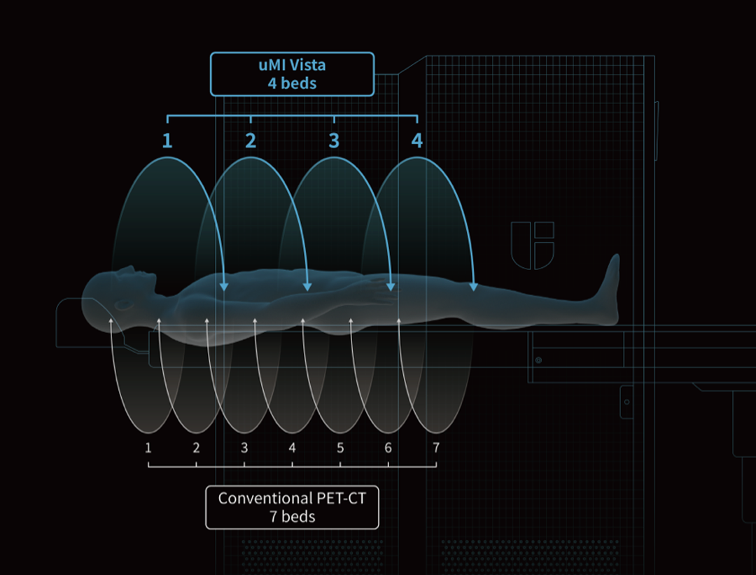Câmpul vizual axial larg de 24 cm și sensibilitatea ridicată a sistemului permit realizarea unei scanări întregului corp în doar 4 poziții de pat.