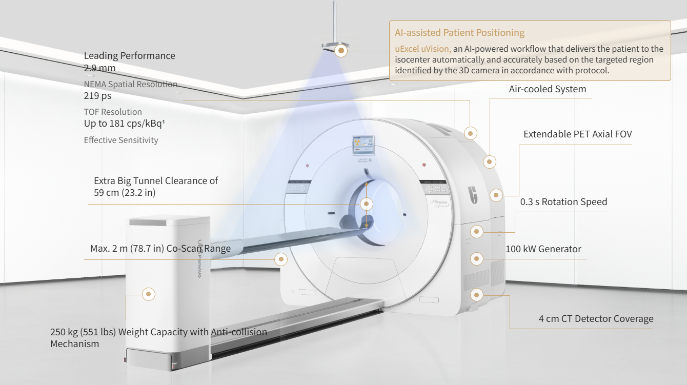 uMI Panvivo oferă cele mai înalte standarde în imagistica PET/CT, combinând rezoluția spațială excepțională, sensibilitatea ridicată și tehnologia TOF de ultimă generație pentru un diagnostic precis și rapid.
